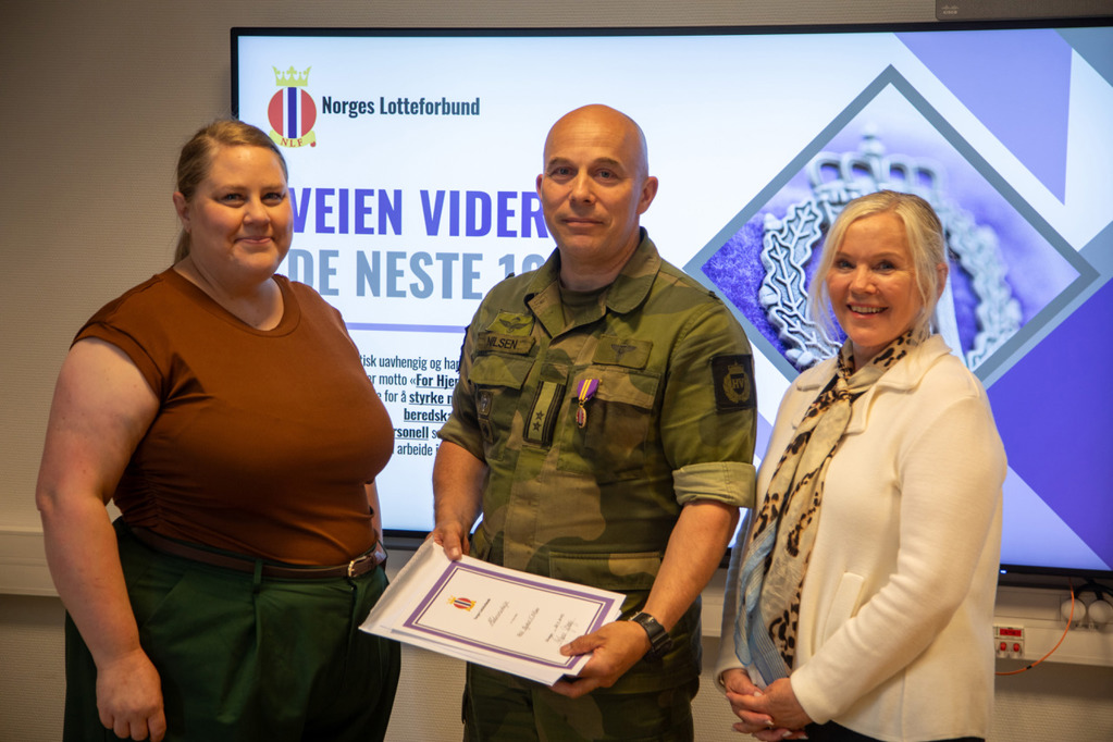 Bildet fra venstre: Stefanie Sprong (nestleder, NLF), Oblt Øystein Fossum Nilsen, Wenche Meinich-Bache (leder Distriktsrådet HV08).